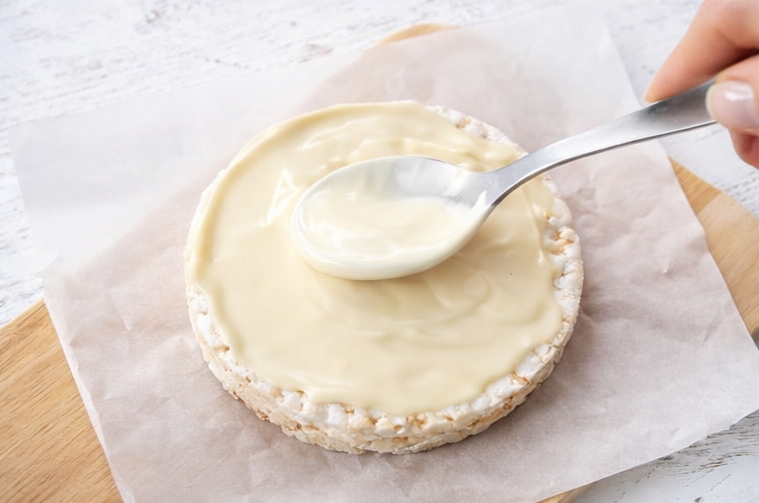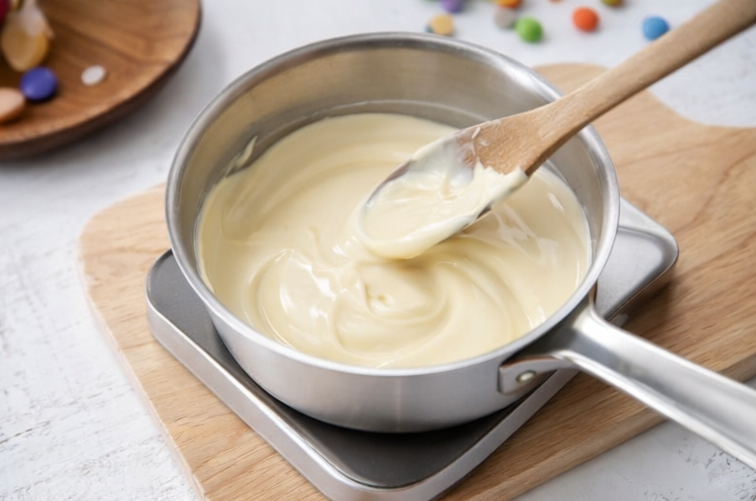 Falls weiße Schokolade verwendet wird, diese vorsichtig im Wasserbad schmelzen. Alternativ kann direkt ein streichfähiger Aufstrich genutzt werden.
