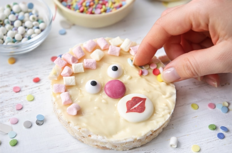 Jetzt wird dekoriert: Augen auflegen, Nasen platzieren, Münder gestalten, Haare aus Streuseln oder Schokoröllchen legen.