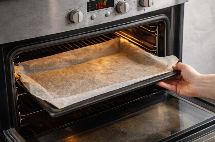 Ein Backblech herausnehmen und mit Backpapier belegen.
