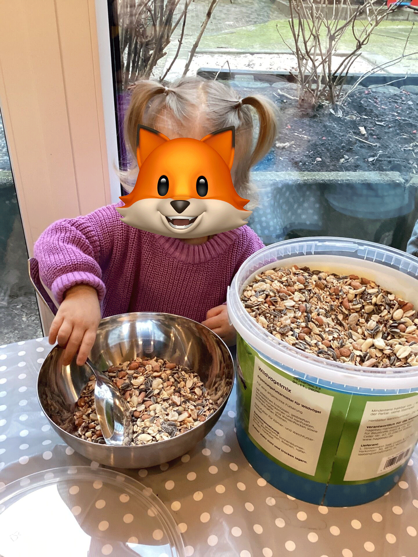 Während unser selbstgemachtes Vogelfutter abkühlte, wanderte ein Teil direkt ins Vogelhäuschen. Seitdem heißt es: Tägliche Vogelbeobachtung! Mit gespitzten Ohren und wachen Kinderaugen zählen wir, wie viele und welche Vögel vorbeischauen.
