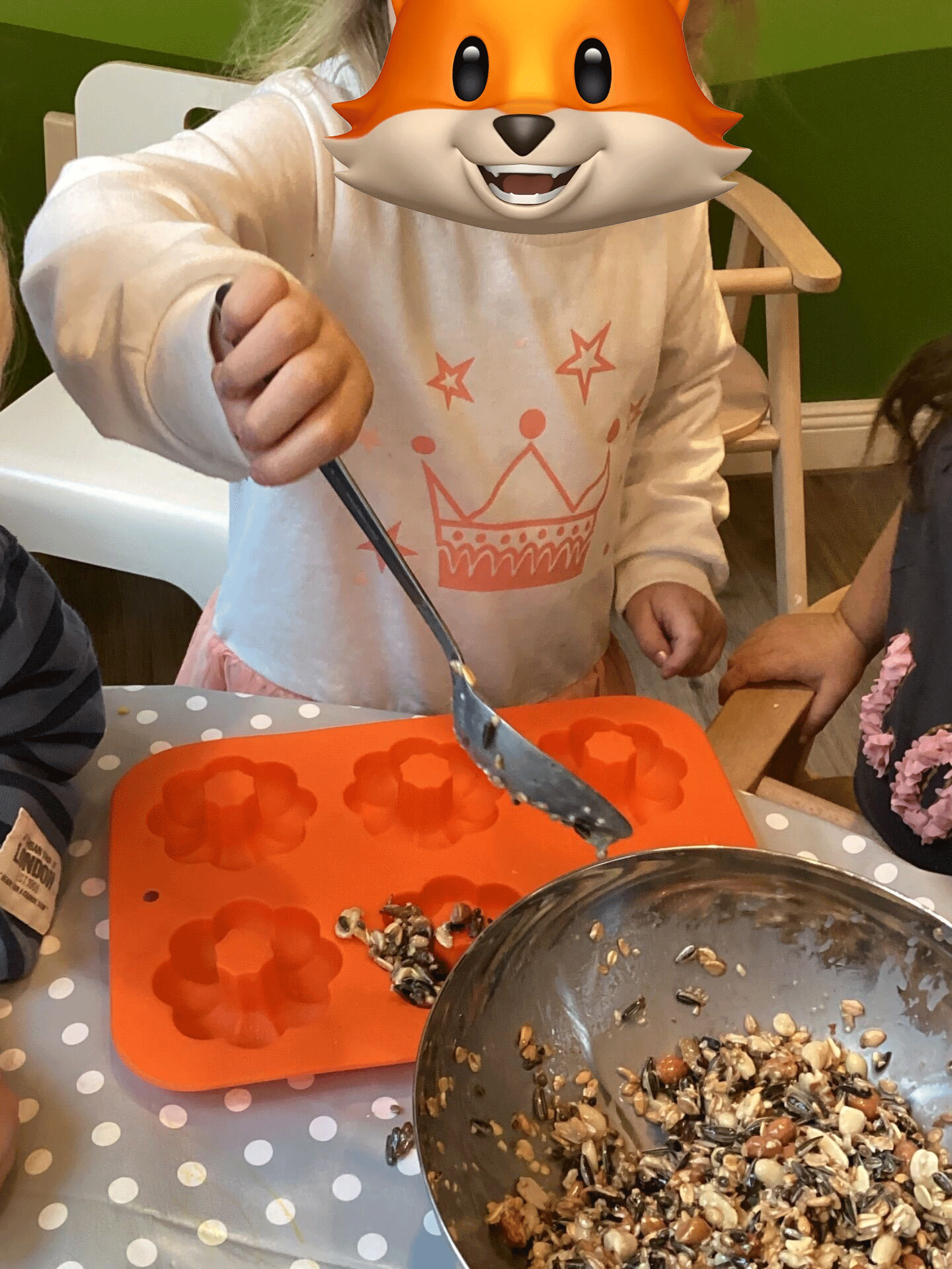 Zuerst haben wir Kokosöl im Wasserbad geschmolzen – was schon an sich eine spannende Aktion war. („Warum wird das erst flüssig und dann wieder fest?“ – beste Gelegenheit für ein kleines Experiment!) Dann wurde das geschmolzene Öl mit dem Vogelfutter vermengt und in Förmchen gefüllt.