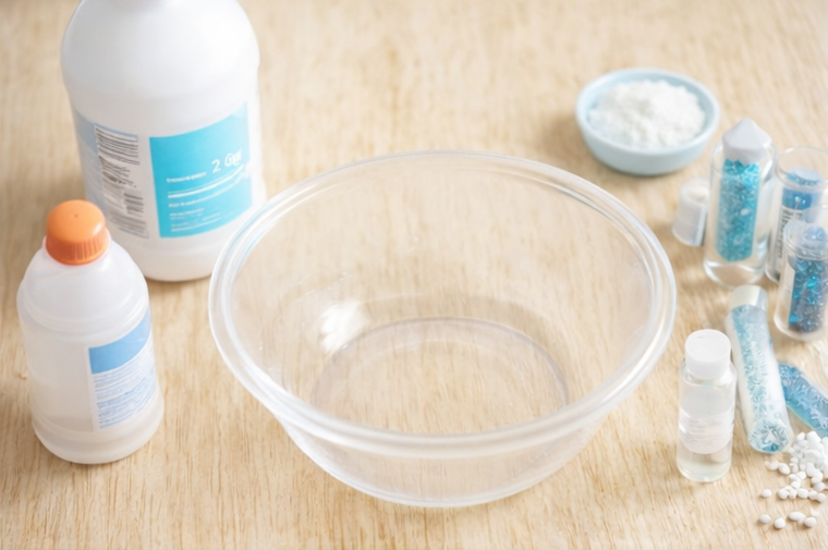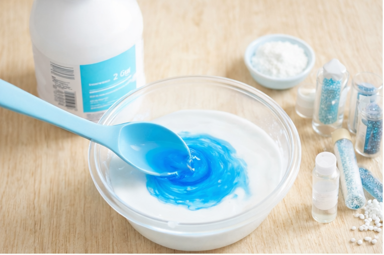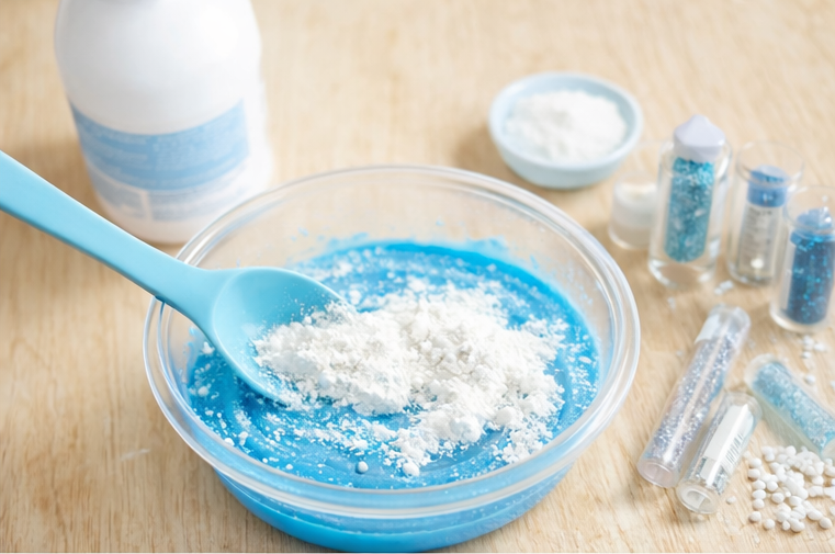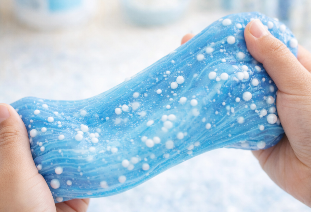 Nehmt den Slime in die Hände. Anfangs klebt er noch etwas, das ist ganz normal. Durch Kneten wird er geschmeidig. Jetzt dürfen Kügelchen oder Glitzer untergemischt werden – wie kleine Schneeflocken im Winter.